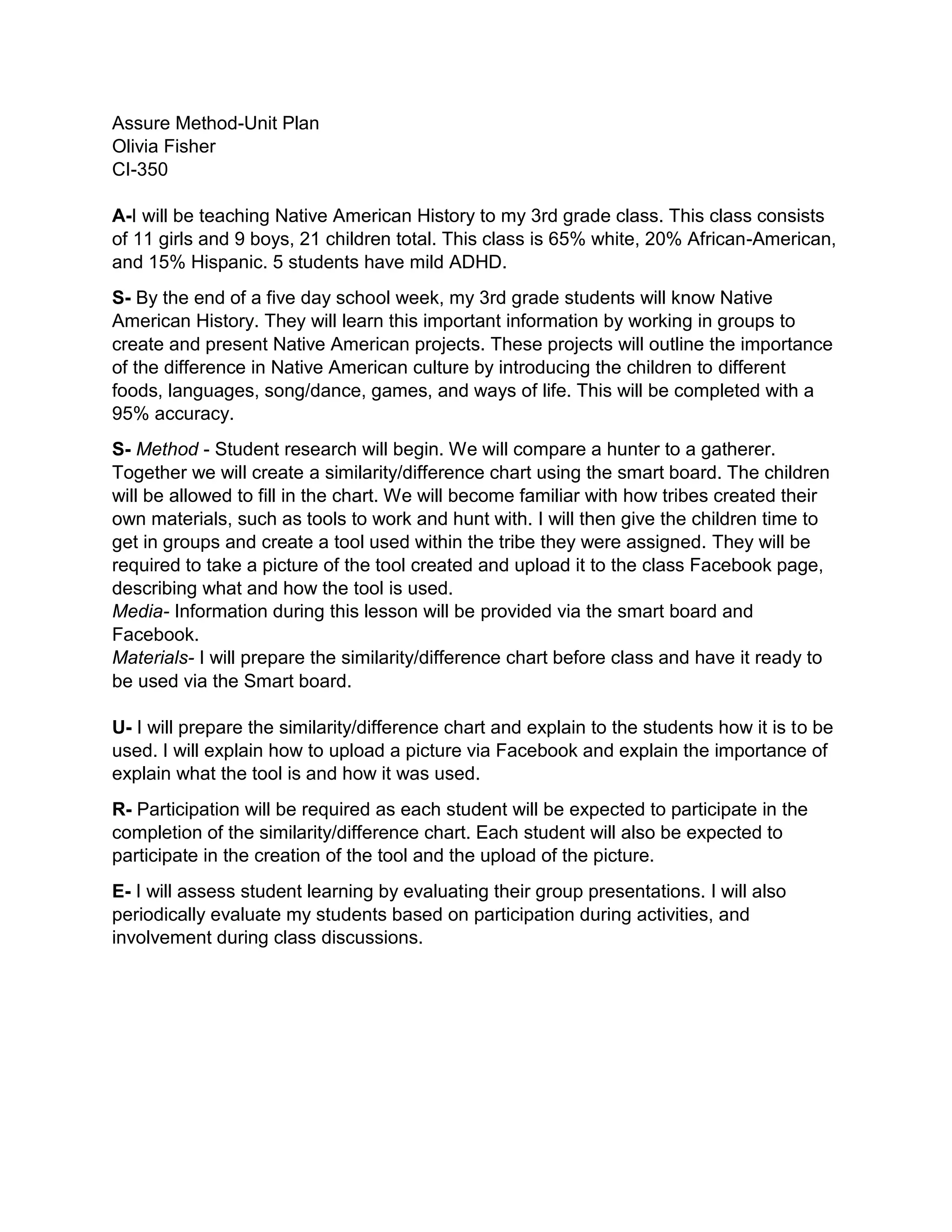 By the end of a five day unit, the 3rd grade class will learn about Native American history. The 21 students will work in groups to create and present projects about Native American culture, including foods, languages, music/dance, games, and ways of life. To do this, the class will compare hunters and gatherers using a smart board chart. Students will then work in groups to create tools used by different tribes and upload pictures and descriptions to a class Facebook page. The teacher will evaluate students on their group presentations and participation during activities and discussions.