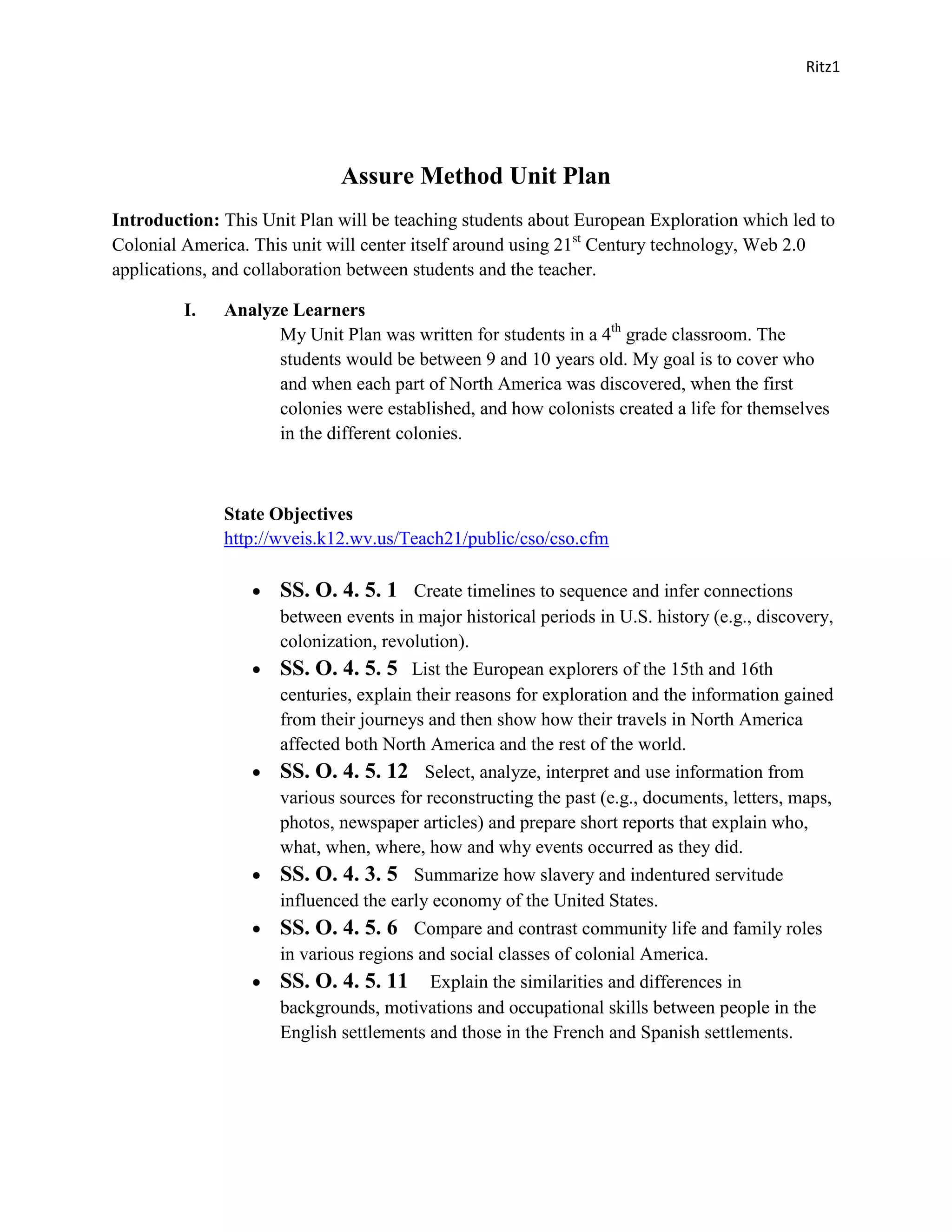 This unit plan aims to teach 4th grade students about European exploration and colonial America through interactive lessons and technology. Over four days, students will: 1) Learn about European explorers through a worksheet and creating explorer maps; 2) Analyze primary sources like maps and photos to infer connections between explorers; 3) Present their explorer projects and create timelines; 4) Learn about the New England, Middle, and Southern colonies through an interactive bulletin board. Throughout, students will complete blog assignments and use technology like smart boards to reinforce concepts.