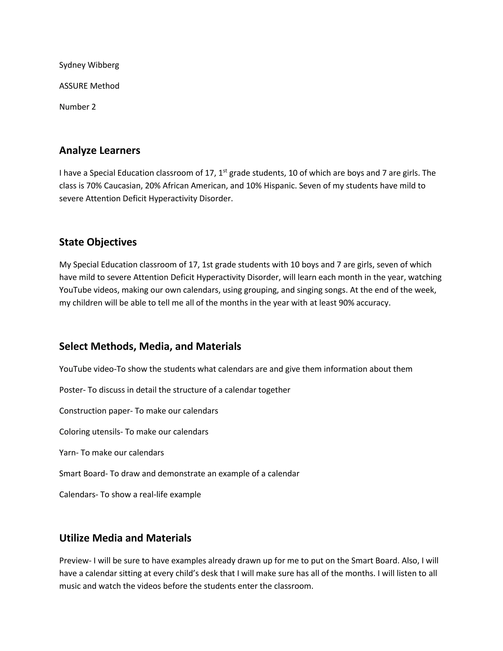 3) The methods include using a YouTube video, poster, construction paper, coloring supplies and a smart board to demonstrate calendars and engage the different learning styles.