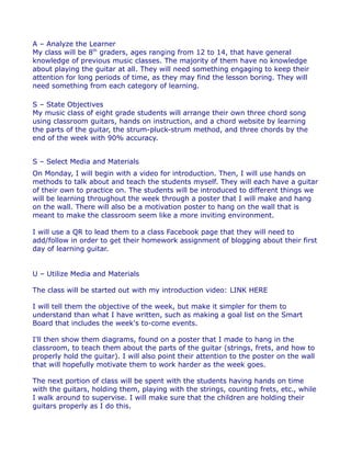 This document outlines a music lesson plan for teaching 8th grade students how to play guitar. It will take place over the course of a week. On the first day, the teacher will introduce the parts of the guitar and proper holding technique using videos and hands-on instruction. Students will each have their own guitar to practice with. Throughout the week, students will learn three chords and the strum-pluck-strum method. They will create and perform their own original three chord song by the end of the lesson, documenting their experience in blog posts along the way. The teacher will evaluate the blog posts to revise and improve future lessons.