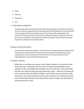 This document outlines a lesson plan to teach 4th grade students about various holiday traditions. There are 20 students from different backgrounds, including Muslims, Jews, and African Americans. The lesson will break students into groups to research Kwanzaa, Eid, Christmas, or Hanukkah. Each group will learn about the history and celebrations of their assigned holiday through videos, stories, songs, crafts and other activities. At the end of the unit, students will present what they learned to the class and take a quiz to evaluate their understanding.