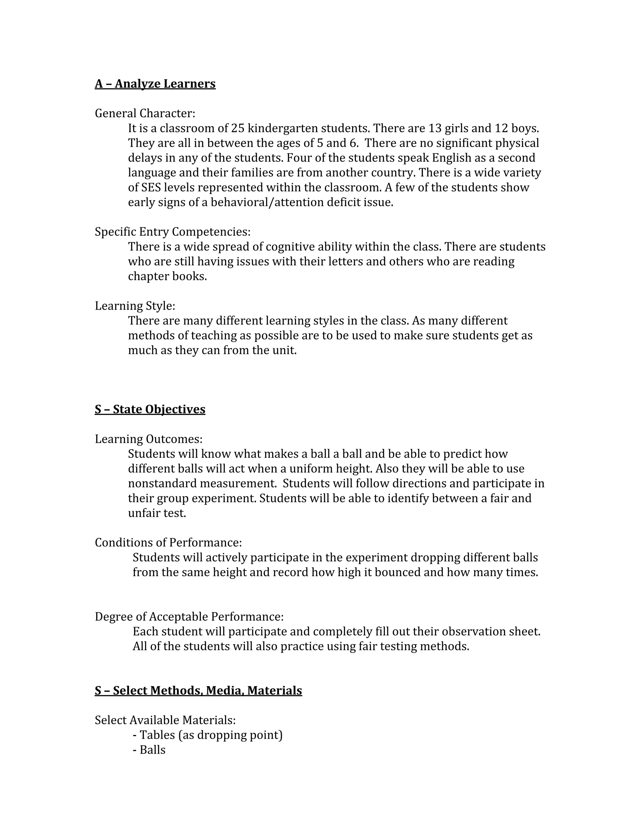This document analyzes a classroom of 25 kindergarten students for a science lesson on balls. It notes there is diversity in gender, age, language, ability levels and learning styles among the students. The learning objective is for students to understand what makes a ball and how different balls bounce when dropped from the same height. Materials selected include balls, tables as drop points, a computer and smart board. A video and podcast will be used to explain fair testing methods. Students will be put into groups, watch the video, then conduct an experiment dropping different balls and recording bounce height and times on observation sheets. Their participation and sheets will be evaluated to assess learning and test fairness.