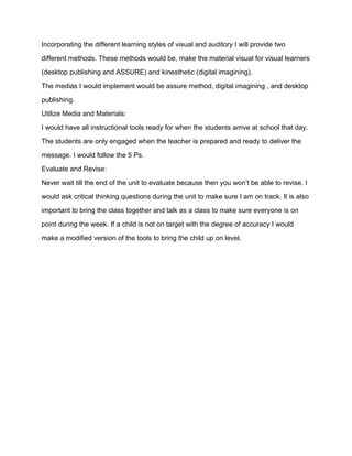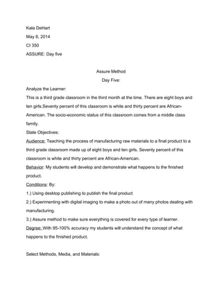 This document outlines an ASSURE lesson plan for a third grade classroom. The classroom has 18 students, with 70% white and 30% African American. The lesson plan aims to teach the process of manufacturing raw materials into a final product. It will use desktop publishing and digital imaging to engage visual and kinesthetic learners. The objectives are for students to understand and demonstrate the manufacturing process with 95-100% accuracy. A variety of methods, media, and materials will be used, including the ASSURE model, digital imaging, and desktop publishing. Evaluation will occur throughout the unit to ensure objectives are met and allow for revision if needed.