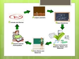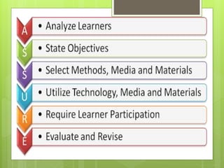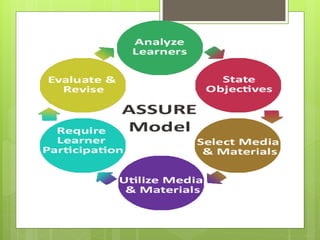 This document outlines the ASSURE model for planning instruction using media. The ASSURE model involves 6 steps: 1) Analyzing learners, 2) Stating objectives, 3) Selecting methods/media/materials, 4) Utilizing media/materials, 5) Requiring learner participation, and 6) Evaluating and revising. Some key aspects include identifying the audience, stating clear and measurable objectives, selecting appropriate instructional methods and media, actively involving learners, and evaluating the effectiveness of the instruction.