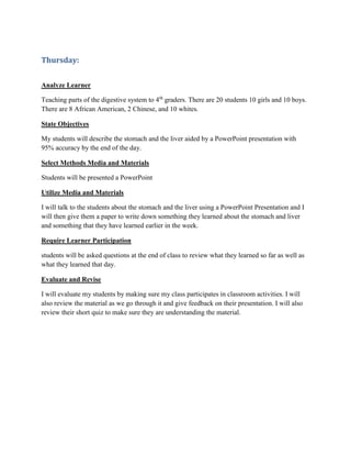 A teacher is preparing to teach a lesson on the digestive system to a 4th grade class of 20 students, consisting of 10 girls and 10 boys, with 8 African American students, 2 Chinese students, and 10 white students. The teacher will use a PowerPoint presentation to describe the stomach and liver to the students, with the objective that 95% of students can accurately describe these organs by the end of the lesson. Students will be asked questions to review what they have learned during the lesson and earlier in the week, and the teacher will evaluate students' participation and provide feedback to ensure they understand the material.