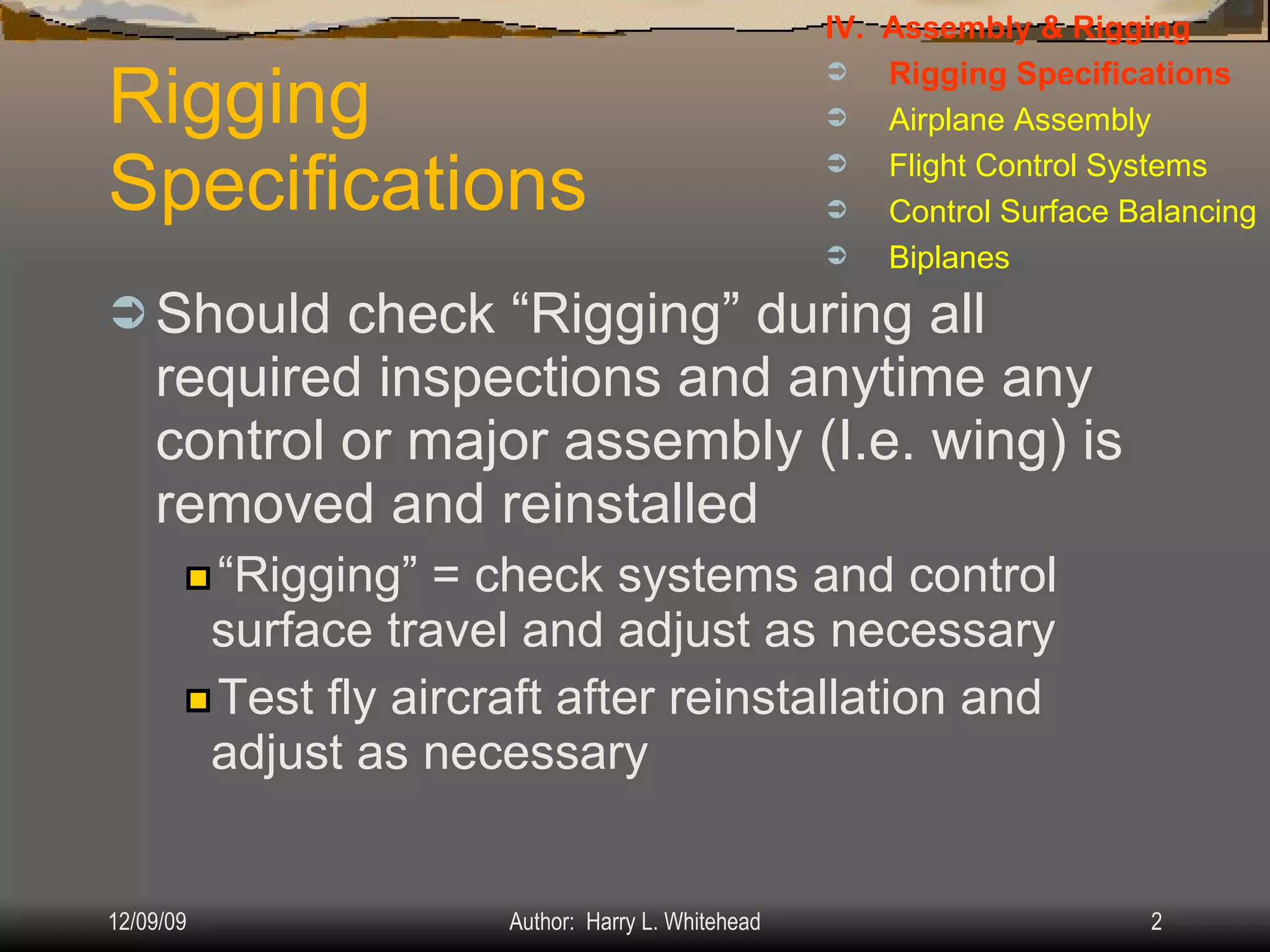 The document discusses rigging specifications and procedures for aircraft assembly and flight control systems. It provides details on:
