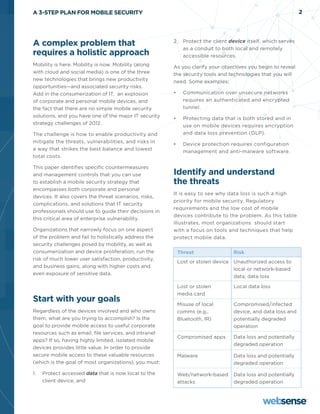 1. A 3-step plan is proposed for mobile security that starts with mobile device management (MDM), adds supplemental security measures like secure access and threat protection, and considers emerging technologies.