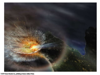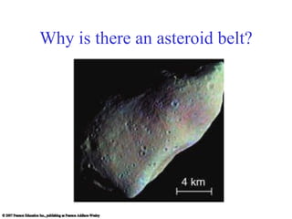 Asteroids are rocky objects that orbit the Sun, mostly located in a belt between Mars and Jupiter. Their irregular shapes indicate they have not undergone geological processes like planets. Some large asteroids even have their own moons. Most meteorites originate from asteroids. Comets are icy objects that originate much further from the Sun in the Kuiper belt and Oort cloud. When heated as they approach the Sun, comets grow dust and plasma tails. Pluto and other large Kuiper belt objects are classified as dwarf planets rather than planets due to their small size and icy composition. Evidence suggests a large asteroid or comet impact was responsible for the mass extinction that killed the dinosaurs 65 million years ago.