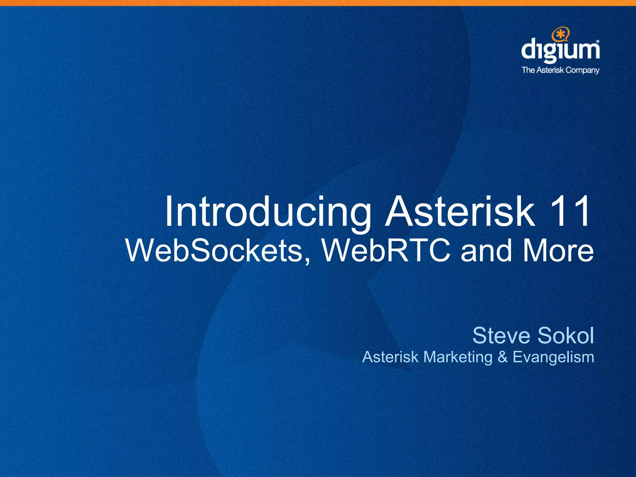 Asterisk 11 is a long term support release of the open source communications platform Asterisk. It includes new features like support for WebSockets and improved Google/Jingle integration to enable real-time communications via web browsers using WebRTC. It also improves support for SIP over WebSockets and new codecs. Asterisk 11 helps enable innovative real-time communication applications by bringing VoIP capabilities to web browsers without additional software.