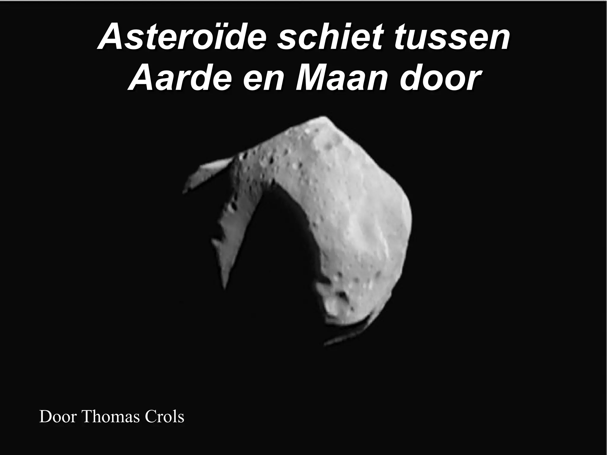 Asteroïde schiet tussenaarde en maan door! Nacht van 09/11/11 Met naam 2005 YU55 Op afstand van 325000 km Veilig volgens NASA Wel zeer uitzonderlijk Laatste keer in 1976 dat zo'n asteroïde zo dicht kwam