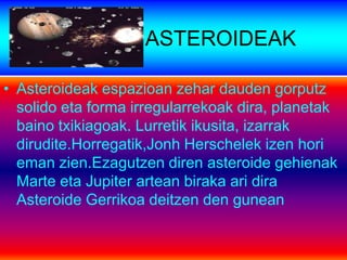 • Asteroideak espazioanzehar dauden gorputz