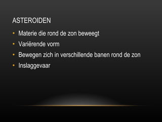 ASTEROIDEN Materie dierond de zon beweegt Variërende vorm Bewegen zich in verschillende banen rond de zon Inslaggevaar - 3.