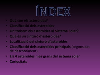 Què són elsasteroides? Classificació dels asteroides On trobem els asteroides al Sistema Solar? Què és un cinturó d’asteroides? Localització del cinturó d’asteroides Classificació dels asteroides principals (segons dat de descobriment) Els 4 asteroides més grans del sistema solar Curiositats