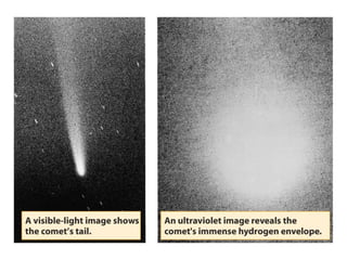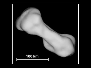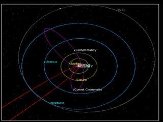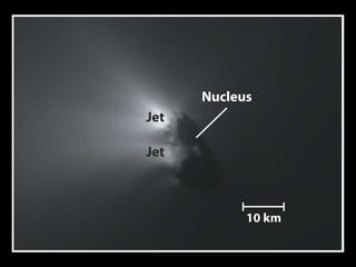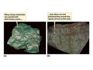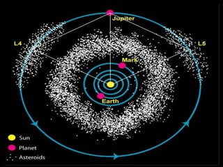 Asteroids, comets, and meteoroids are small rocky or icy bodies that orbit the sun. Thousands of asteroids orbit in the asteroid belt between Mars and Jupiter. Asteroids are remnants of early planet formation. Comets are composed of ice and dust and have highly elliptical orbits, forming tails as they near the sun due to heating. When meteoroids enter Earth's atmosphere, they burn up and are seen as meteors or shooting stars. Those that survive are called meteorites and sometimes leave impact craters. Analysis of meteorites provides clues about early solar system formation and even the origin of life.