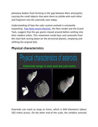 Asteroids are rocky bodies orbiting the sun that vary in size and can pose a threat to Earth. They formed from the remnants of our solar system's formation and are classified into three main types based on composition: C-type, S-type, and M-type. Research on asteroids and meteoroids informs our understanding of the early solar system and impacts on Earth.