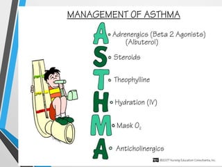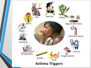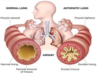 Asthma is a chronic inflammatory disorder of the airways, leading to symptoms like wheezing, breathlessness, and cough, with a higher prevalence among adult women. The condition is influenced by various triggers, including allergens, air pollutants, and occupational exposures, and classified into types such as allergic, non-allergic, and mixed asthma. Treatment includes long-term control medications, quick relief options, and patient education on proper medication use, with lifestyle factors like vitamin D levels playing a role in management.