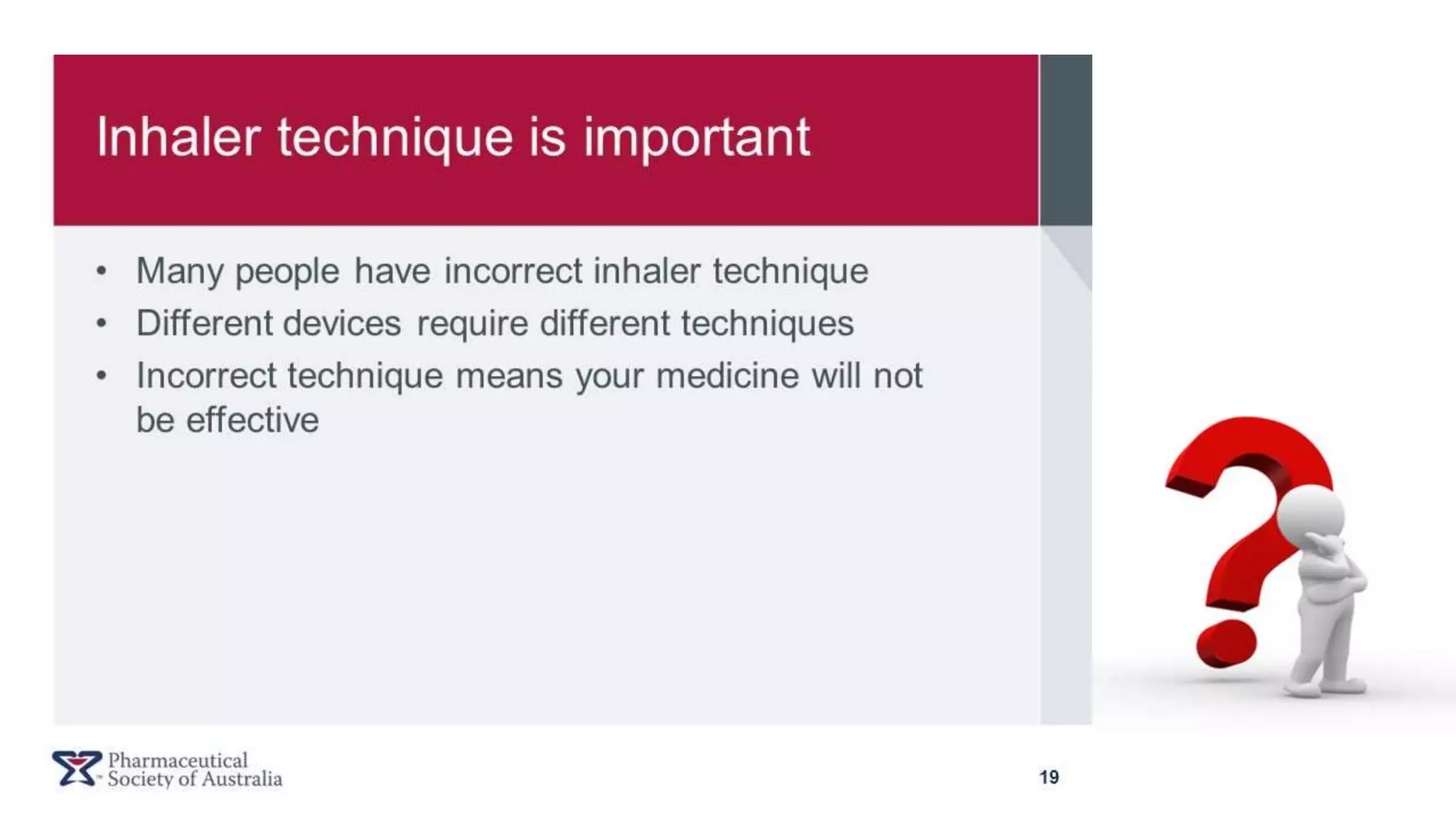 - Proper inhaler technique is important for effective delivery of medication to the lungs.