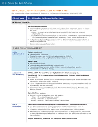 The document is a quick reference guide from the National Asthma Education and Prevention Program aimed at helping clinicians provide quality asthma care, emphasizing the importance of both initial diagnosis and long-term management. Key components include assessing asthma severity, initiating appropriate medication, developing asthma action plans, and providing patient education for self-management. The guide provides systematic recommendations based on a review of asthma care literature and includes information on specific medication strategies, follow-up procedures, and management of exacerbations.