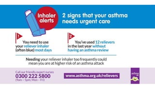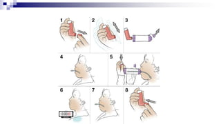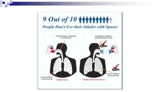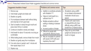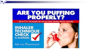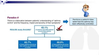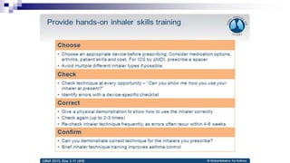 The document discusses reasons for poor asthma control and strategies for improving inhaler technique and medication adherence. Some key points include:
