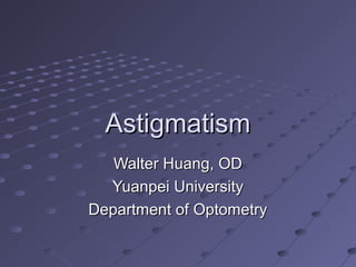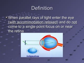 Astigmatism is a refractive error caused by unequal curvature of the cornea or lens, leading to multiple focus points rather than a single point on the retina. It can be classified into corneal, lenticular, and total astigmatism, with further subdivisions into regular and irregular types based on the orientation of principal meridians. Management options include corrective lenses, contact lenses, and refractive surgery such as LASIK and PRK.