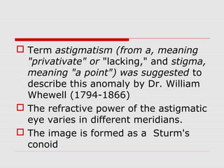 Astigmatism is a condition where the eye's refractive power varies in different meridians, causing blurred vision. It is caused most commonly by corneal irregularities, and results in light rays forming an image called the Sturm's conoid instead of focusing on the retina. Astigmatism can be regular, irregular, or oblique depending on the orientation of the steepest meridians. It is classified and treated based on whether the refractive error causes light to focus in front of, on, or behind the retina. Treatment options include corrective lenses, contact lenses, and refractive surgeries like astigmatic keratotomy.