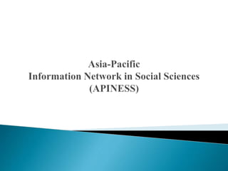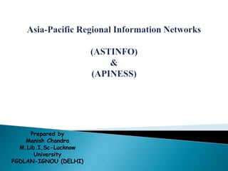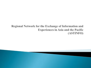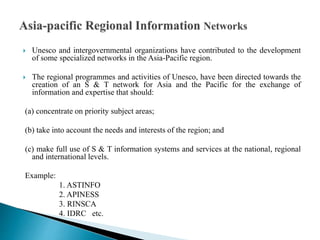 The document discusses the establishment of regional information networks in Asia and the Pacific by UNESCO, including ASTINFO and its associated networks. It provides details on the objectives, infrastructure, activities and developments of ASTINFO and some of its specialized sub-networks such as APINMAP, INNERTAP, and APINESS. The networks aimed to strengthen information sharing, promote research, and support development across the region through coordinated activities between national and regional nodes.