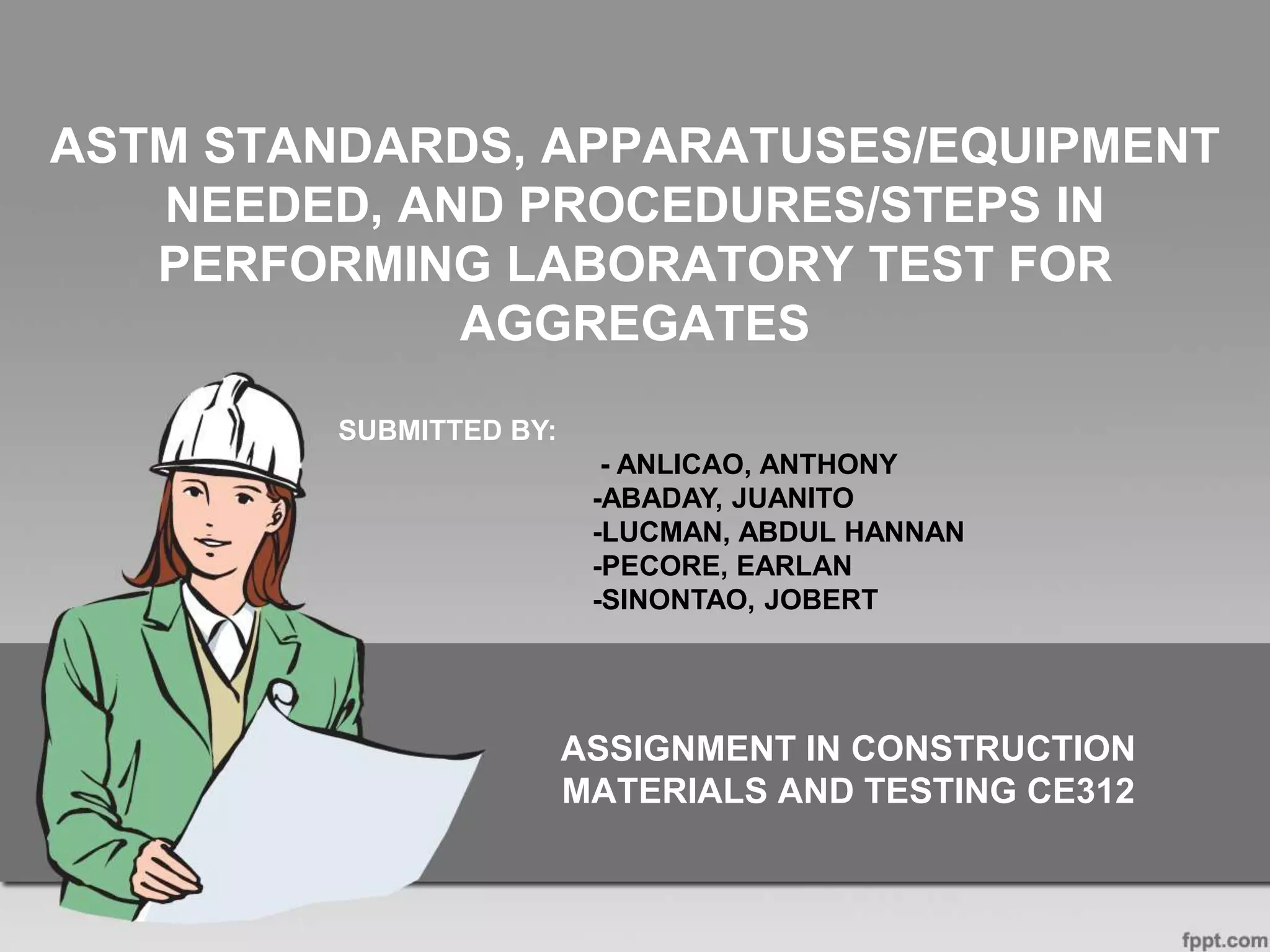 This document provides information on performing laboratory tests for aggregates, including specific gravity and water absorption tests. It lists the necessary ASTM standards, equipment, and step-by-step procedures for conducting the tests on both coarse and fine aggregates. The tests involve steps such as drying samples, weighing them in various conditions to determine densities, soaking samples in water, and calculating absorption percentages. Proper handling and storage of test weights and equipment is also emphasized to ensure accurate results.