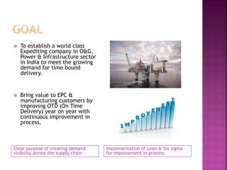The document discusses expediter services which involve facilitating timely processing and shipment of ordered materials. Expediters monitor order progress, address any issues or delays, and ensure on-time delivery. The goal is to establish an expediter company in India that brings value to customers in industries like oil and gas by continuously improving on-time delivery. The expediter duties involve both desk expediting using communication tools as well as field expediting with on-site status checks. Key performance metrics are also tracked to monitor order status. The company aims to initially operate with a small team serving a few major contract clients to prove its expediter service model.