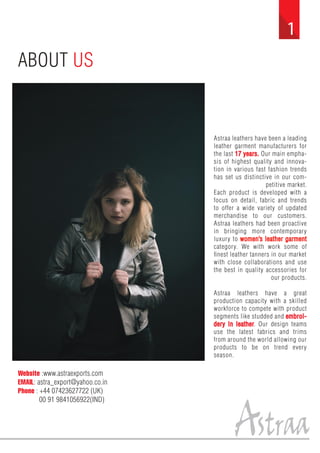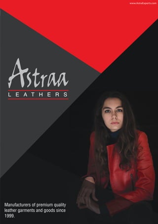 Astraa Leathers has been a leading manufacturer of premium quality leather garments and goods since 1999. They focus on high quality and innovation in fast fashion trends. Each product is developed with attention to detail, fabric, and current trends to offer varied merchandise to customers. Astraa Leathers works with some of the finest leather tanners and uses quality accessories in its products. It has a large production capacity and skilled workforce to create studded, embroidered, and printed leather goods.
