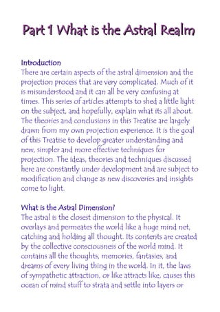 This document provides an overview of the astral realm and astral projection. It discusses what the astral dimension is, how thought forms are created there, dreams, astral vision, and common experiences during astral projection like reversal effects and melting hands. The key points are: