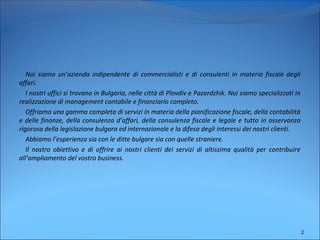 Astrea Consult Ltd è un'azienda bulgara che offre servizi contabili e di consulenza fiscale, specializzandosi nella pianificazione fiscale e nella gestione finanziaria per clienti sia locali che stranieri. La società si impegna a garantire un alto livello di qualità e professionalità, utilizzando un approccio personalizzato per soddisfare le esigenze dei propri clienti. Il loro obiettivo è supportare la crescita e lo sviluppo delle aziende collaborando attivamente con i clienti e rispettando la legislazione vigente.