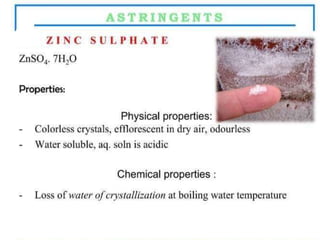 Mrs. Dipali M.K. Kulkarni is an assistant professor at the Yash Institute of Pharmacy in Aurangabad. Astringents are agents that are applied locally and cause protein precipitation on surfaces. They constrict tissues and reduce cell permeability by contracting and wrinkling tissues as well as constricting local blood vessels and inhibiting the movement of plasma proteins through capillaries. The net effects of astringents are that they have anti-inflammatory, hemostatic, and antimicrobial properties by decreasing blood supply, coagulating proteins to decrease bleeding, reducing sweating by shrinking skin pores, and inhibiting microbes through protein precipitation reactions.