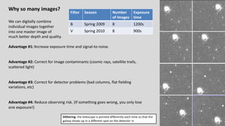 The M101 data reduction and analysis project aims to process imaging data of the spiral galaxy M101 from the Burrell Schmidt telescope using two filters (B and V). The project involves steps like photometric calibration, measuring surface brightness and color profiles, and combining individual images for enhanced quality by correcting for various image contaminants. The final goal is to prepare scientific-ready images and write up the findings in a research journal style.