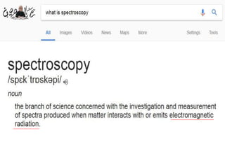 This document discusses the use of spectroscopy in astronomical observations. Spectroscopy can be used to derive many properties of distant stars and galaxies, such as chemical composition, temperature, density, mass, distance, luminosity, and relative motion. However, Earth's atmosphere interferes with certain wavelengths of light. Infrared and ultraviolet light are absorbed, requiring the use of satellites. Spectroscopy has also been used to discover compounds in exoplanet atmospheres like water vapor and methane. Future advancements may allow astronomers to better study objects and find habitable planets.