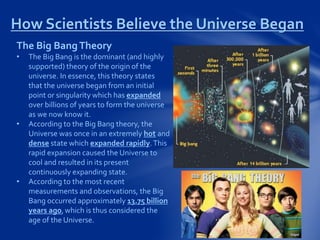 The document summarizes key aspects of how scientists believe the universe began and evolved based on two major theories - the Big Bang theory and the Solar Nebula theory. It provides details on each theory, including that the Big Bang occurred approximately 13.75 billion years ago and resulted in the rapid expansion and cooling of an extremely hot and dense early universe. The Solar Nebula theory proposes that our solar system formed from a collapsing cloud of gas and dust that gave rise to the sun and orbiting bodies.