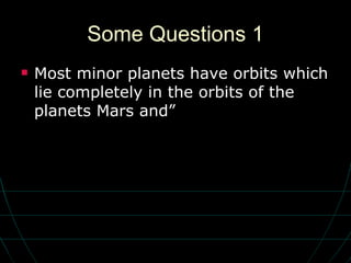 2. The questions cover topics like the structure of the solar system, properties of comets and asteroids, formation of the solar system, characteristics of planets and stars, and processes that occur on the sun.