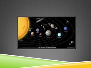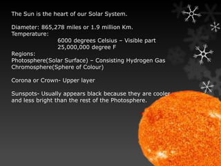 The document provides detailed information about the planets in our solar system, highlighting their size, distance from the sun, and key characteristics. It explains the sun as the center of the solar system, discusses the nature of each planet from Mercury to Neptune, and includes facts about Pluto and Earth's moon. The data covers aspects like atmosphere, surface conditions, and rotation periods for each celestial body.