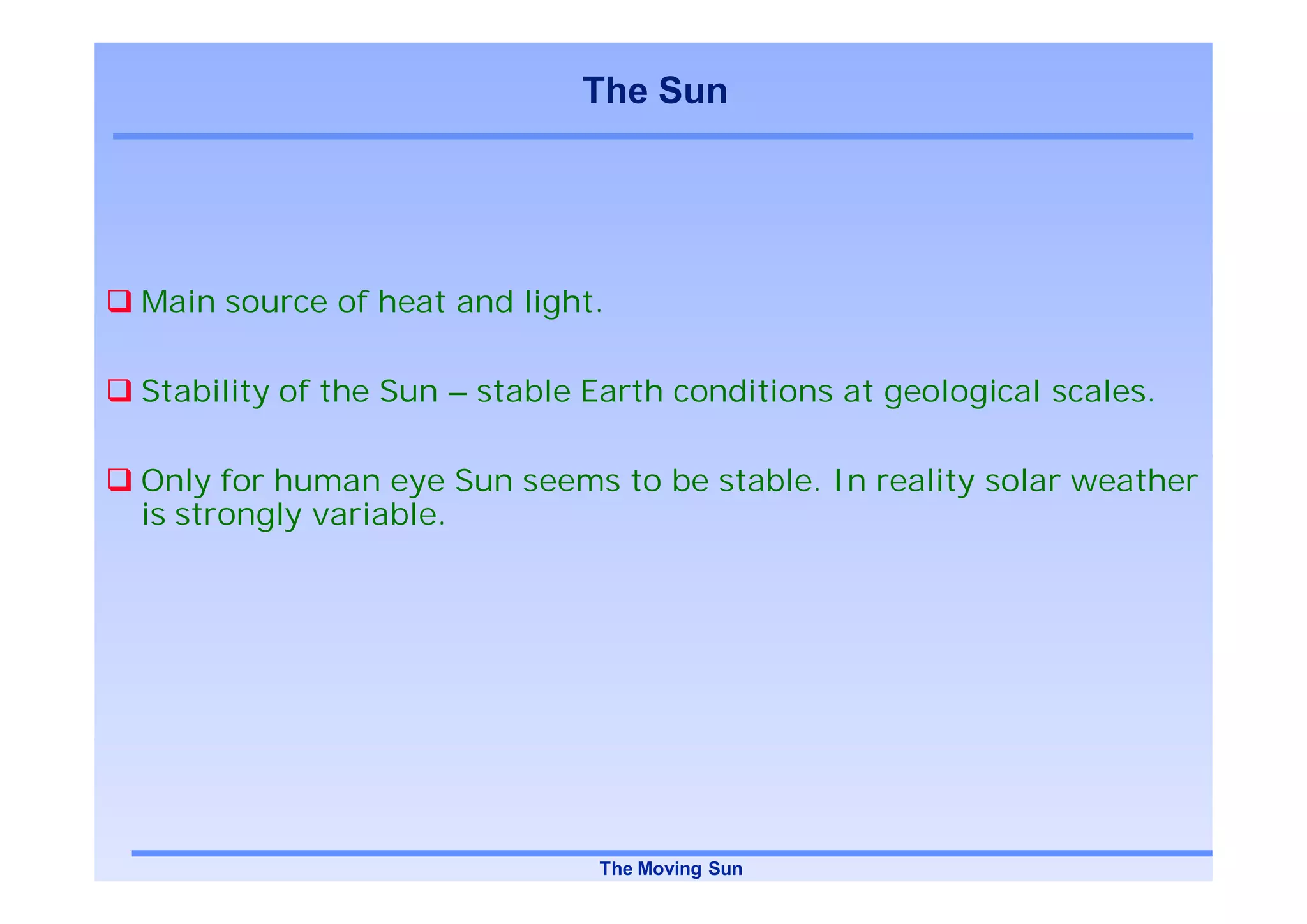 The Sun is a dynamic star whose activity and variability directly influence conditions on Earth. The Sun's atmosphere, including the photosphere, chromosphere, and corona, undergo continuous changes driven by the Sun's magnetic field and interior dynamics. Small-scale magnetic features and energetic events throughout the solar atmosphere, such as spicules in the chromosphere and nanoflares in the corona, are thought to play an important role in heating the Sun's million-degree outer atmosphere through dissipation of magnetic energy. Observatories such as SOHO, STEREO, and Hinode provide continuous monitoring of the Sun to improve understanding of its complex variability and influence.