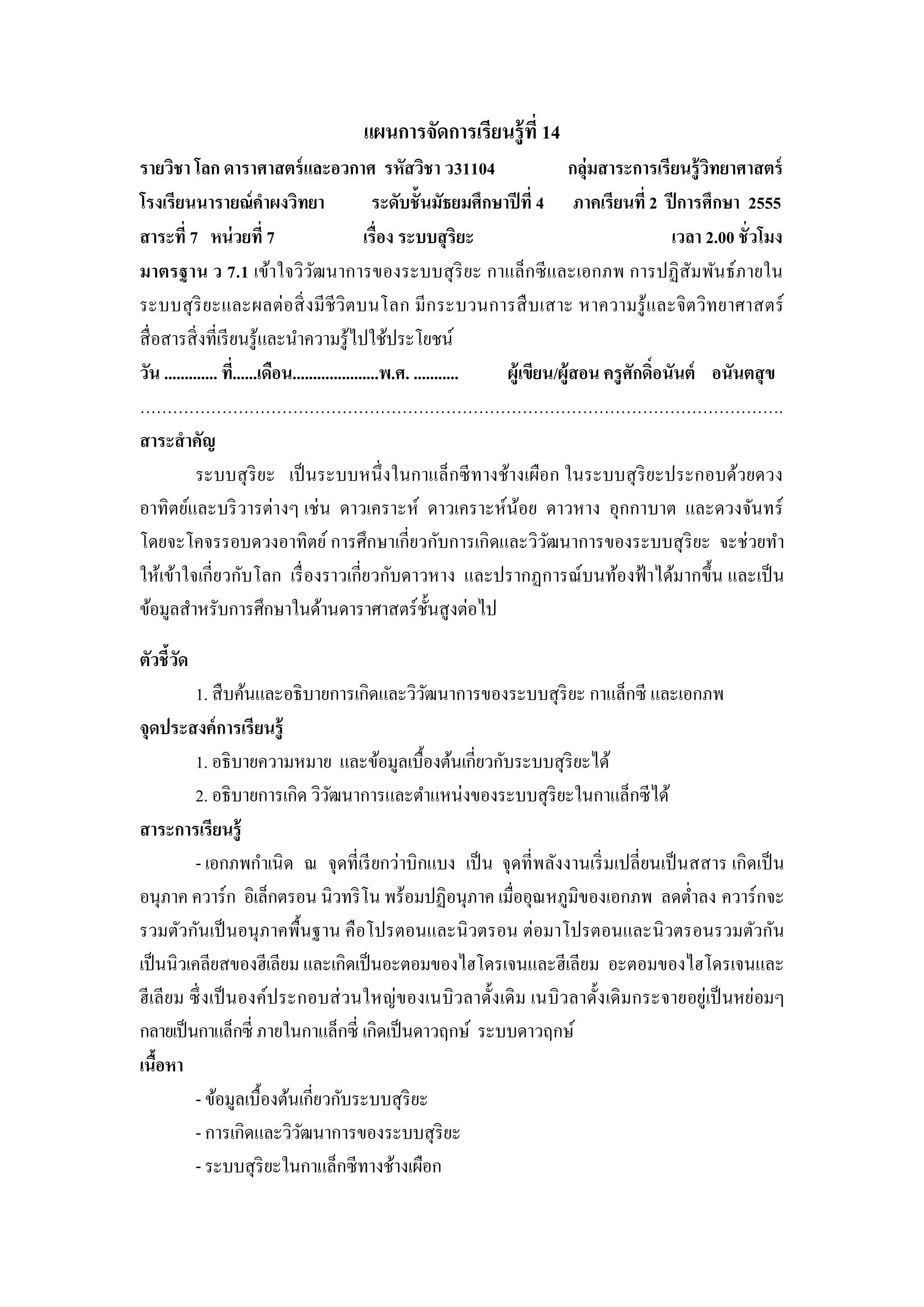 โลก ดาราศาสตร์ และอวกาศ รหัสวิชา ว31104 กลุ่มสาระการเรี ยนรู้ วทยาศาสตร์ ิ โรงเรียนนารายณ์คาผงวิทยา ระดับชั้นมัธยมศึกษาปี ที่ 4 ภาคเรียนที่ 2 ปี การศึกษา 2555 สาระที่ 7 หน่ วยที่ 7 เรื่อง ระบบสุ ริยะ เวลา 2.00 ชั่วโมง มาตรฐาน ว 7.1 เข้าใจวิวฒนาการของระบบสุ ริยะ กาแล็กซี และเอกภพ การปฏิ สัมพันธ์ภายใน ั ระบบสุ ริย ะและผลต่อสิ่ ง มี ชีวิตบนโลก มี ก ระบวนการสื บ เสาะ หาความรู้ และจิตวิทยาศาสตร์ สื่ อสารสิ่ งที่เรี ยนรู ้และนาความรู ้ไปใช้ประโยชน์ วัน ............. ที.่ .....เดือน.....................พ.ศ. ........... ผู้เขียน/ผู้สอน ครู ศักดิ์อนันต์ อนันตสุ ข ………………………………………………………………………………………………………. สาระสาคัญ ระบบสุ ริยะ เป็ นระบบหนึ่ งในกาแล็กซี ทางช้างเผือก ในระบบสุ ริยะประกอบด้วยดวง อาทิตย์และบริ วารต่างๆ เช่ น ดาวเคราะห์ ดาวเคราะห์น้อย ดาวหาง อุกกาบาต และดวงจันทร์ โดยจะโคจรรอบดวงอาทิตย์ การศึกษาเกี่ยวกับการเกิ ดและวิวฒนาการของระบบสุ ริยะ จะช่ วยทา ั ให้เข้าใจเกี่ ยวกับโลก เรื่ องราวเกี่ยวกับดาวหาง และปรากฏการณ์ บนท้องฟ้ าได้มากขึ้น และเป็ น ข้อมูลสาหรับการศึกษาในด้านดาราศาสตร์ ช้ นสู งต่อไป ั ตัวชี้วด ั 1. สื บค้นและอธิ บายการเกิดและวิวฒนาการของระบบสุ ริยะ กาแล็กซี และเอกภพ ั จุดประสงค์ การเรี ยนรู้ 1. อธิ บายความหมาย และข้อมูลเบื้องต้นเกี่ยวกับระบบสุ ริยะได้ 2. อธิ บายการเกิด วิวฒนาการและตาแหน่งของระบบสุ ริยะในกาแล็กซีได้ ั สาระการเรียนรู้ - เอกภพกาเนิ ด ณ จุดที่เรี ยกว่าบิกแบง เป็ น จุดที่พลังงานเริ่ มเปลี่ ยนเป็ นสสาร เกิ ดเป็ น อนุภาค ควาร์ก อิเล็กตรอน นิวทริ โน พร้อมปฏิอนุภาค เมื่ออุณหภูมิของเอกภพ ลดต่าลง ควาร์ กจะ รวมตัวกันเป็ นอนุ ภาคพื้นฐาน คื อโปรตอนและนิ วตรอน ต่อมาโปรตอนและนิ วตรอนรวมตัวกัน เป็ นนิวเคลียสของฮีเลียม และเกิดเป็ นอะตอมของไฮโดรเจนและฮีเลียม อะตอมของไฮโดรเจนและ ฮี เลี ยม ซึ่ งเป็ นองค์ประกอบส่ วนใหญ่ของเนบิ วลาดั้ง เดิ ม เนบิ วลาดั้ง เดิ มกระจายอยู่เป็ นหย่อมๆ กลายเป็ นกาแล็กซี่ ภายในกาแล็กซี่ เกิดเป็ นดาวฤกษ์ ระบบดาวฤกษ์ เนือหา ้ - ข้อมูลเบื้องต้นเกี่ยวกับระบบสุ ริยะ - การเกิดและวิวฒนาการของระบบสุ ริยะ ั - ระบบสุ ริยะในกาแล็กซีทางช้างเผือก