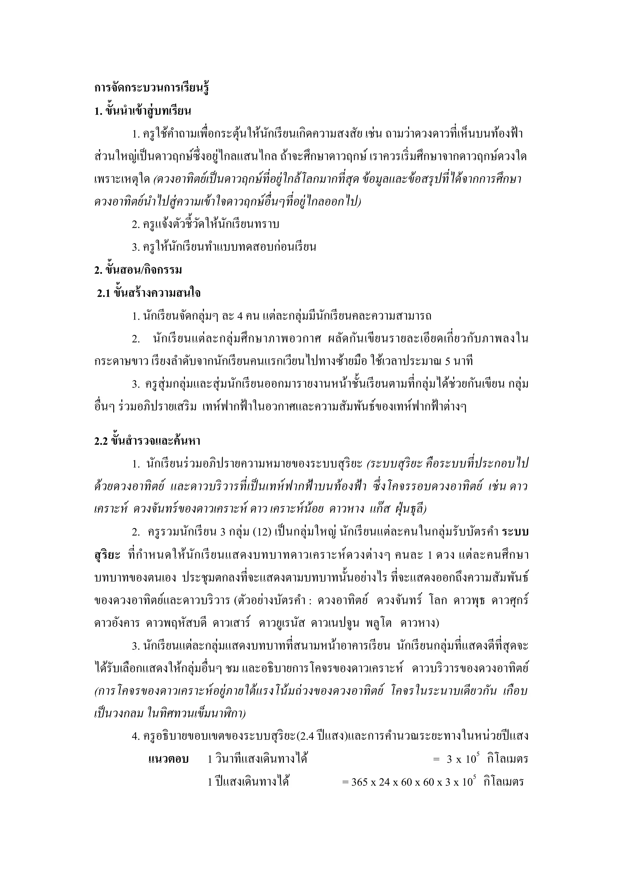 บทเรียน 1. ครู ใช้คาถามเพื่อกระตุนให้นกเรี ยนเกิดความสงสัย เช่น ถามว่าดวงดาวที่เห็นบนท้องฟ้ า ้ ั ่ ส่ วนใหญ่เป็ นดาวฤกษ์ซ่ ึ งอยูไกลแสนไกล ถ้าจะศึกษาดาวฤกษ์ เราควรเริ่ มศึกษาจากดาวฤกษ์ดวงใด เพราะเหตุใด (ดวงอาทิ ตย์ เป็ นดาวฤกษ์ ที่อยู่ใกล้ โลกมากที่สุด ข้ อมูลและข้ อสรุ ปที่ได้ จากการศึกษา ดวงอาทิ ตย์ นาไปสู่ความเข้ าใจดาวฤกษ์ อื่นๆที่อยู่ไกลออกไป) 2. ครู แจ้งตัวชี้วดให้นกเรี ยนทราบ ั ั 3. ครู ให้นกเรี ยนทาแบบทดสอบก่อนเรี ยน ั 2. ขั้นสอน/กิจกรรม 2.1 ขั้นสร้ างความสนใจ 1. นักเรี ยนจัดกลุ่มๆ ละ 4 คน แต่ละกลุ่มมีนกเรี ยนคละความสามารถ ั 2. นักเรี ยนแต่ ล ะกลุ่ มศึ กษาภาพอวกาศ ผลัดกันเขี ย นรายละเอี ยดเกี่ ย วกับ ภาพลงใน กระดาษขาว เรี ยงลาดับจากนักเรี ยนคนแรกเวียนไปทางซ้ายมือ ใช้เวลาประมาณ 5 นาที 3. ครู สุ่มกลุ่มและสุ่ มนักเรี ยนออกมารายงานหน้าชั้นเรี ยนตามที่กลุ่มได้ช่วยกันเขียน กลุ่ม อื่นๆ ร่ วมอภิปรายเสริ ม เทห์ฟากฟ้ าในอวกาศและความสัมพันธ์ของเทห์ฟากฟ้ าต่างๆ 2.2 ขั้นสารวจและค้ นหา 1. นักเรี ยนร่ วมอภิปรายความหมายของระบบสุ ริยะ (ระบบสุ ริยะ คื อระบบที่ ประกอบไป ด้ วยดวงอาทิ ตย์ และดาวบริ วารที่ เป็ นเทห์ ฟากฟ้ าบนท้ องฟ้ า ซึ่ งโคจรรอบดวงอาทิ ตย์ เช่ น ดาว เคราะห์ ดวงจันทร์ ของดาวเคราะห์ ดาว เคราะห์ น้อย ดาวหาง แก๊ ส ฝุ่ นธุลี) 2. ครู รวมนักเรี ยน 3 กลุ่ม (12) เป็ นกลุ่มใหญ่ นักเรี ยนแต่ละคนในกลุ่มรับบัตรคา ระบบ สุ ริยะ ที่ ก าหนดให้นัก เรี ย นแสดงบทบาทดาวเคราะห์ ดวงต่ า งๆ คนละ 1 ดวง แต่ ล ะคนศึ ก ษา บทบาทของตนเอง ประชุมตกลงที่จะแสดงตามบทบาทนั้นอย่างไร ที่จะแสดงออกถึงความสัมพันธ์ ของดวงอาทิตย์และดาวบริ วาร (ตัวอย่างบัตรคา : ดวงอาทิตย์ ดวงจันทร์ โลก ดาวพุธ ดาวศุกร์ ดาวอังคาร ดาวพฤหัสบดี ดาวเสาร์ ดาวยูเรนัส ดาวเนปจูน พลูโต ดาวหาง) 3. นักเรี ยนแต่ละกลุ่มแสดงบทบาทที่สนามหน้าอาคารเรี ยน นักเรี ยนกลุ่มที่แสดงดีที่สุดจะ ได้รับเลือกแสดงให้กลุ่มอื่นๆ ชม และอธิ บายการโคจรของดาวเคราะห์ ดาวบริ วารของดวงอาทิตย์ (การโคจรของดาวเคราะห์ อยู่ภายใต้ แรงโน้ มถ่ วงของดวงอาทิ ตย์ โคจรในระนาบเดี ยวกัน เกื อบ เป็ นวงกลม ในทิศทวนเข็มนาฬิกา) 4. ครู อธิ บายขอบเขตของระบบสุ ริยะ(2.4 ปี แสง)และการคานวณระยะทางในหน่วยปี แสง แนวตอบ 1 วินาทีแสงเดินทางได้ = 3 x 105 กิโลเมตร 1 ปี แสงเดินทางได้ = 365 x 24 x 60 x 60 x 3 x 105 กิโลเมตร