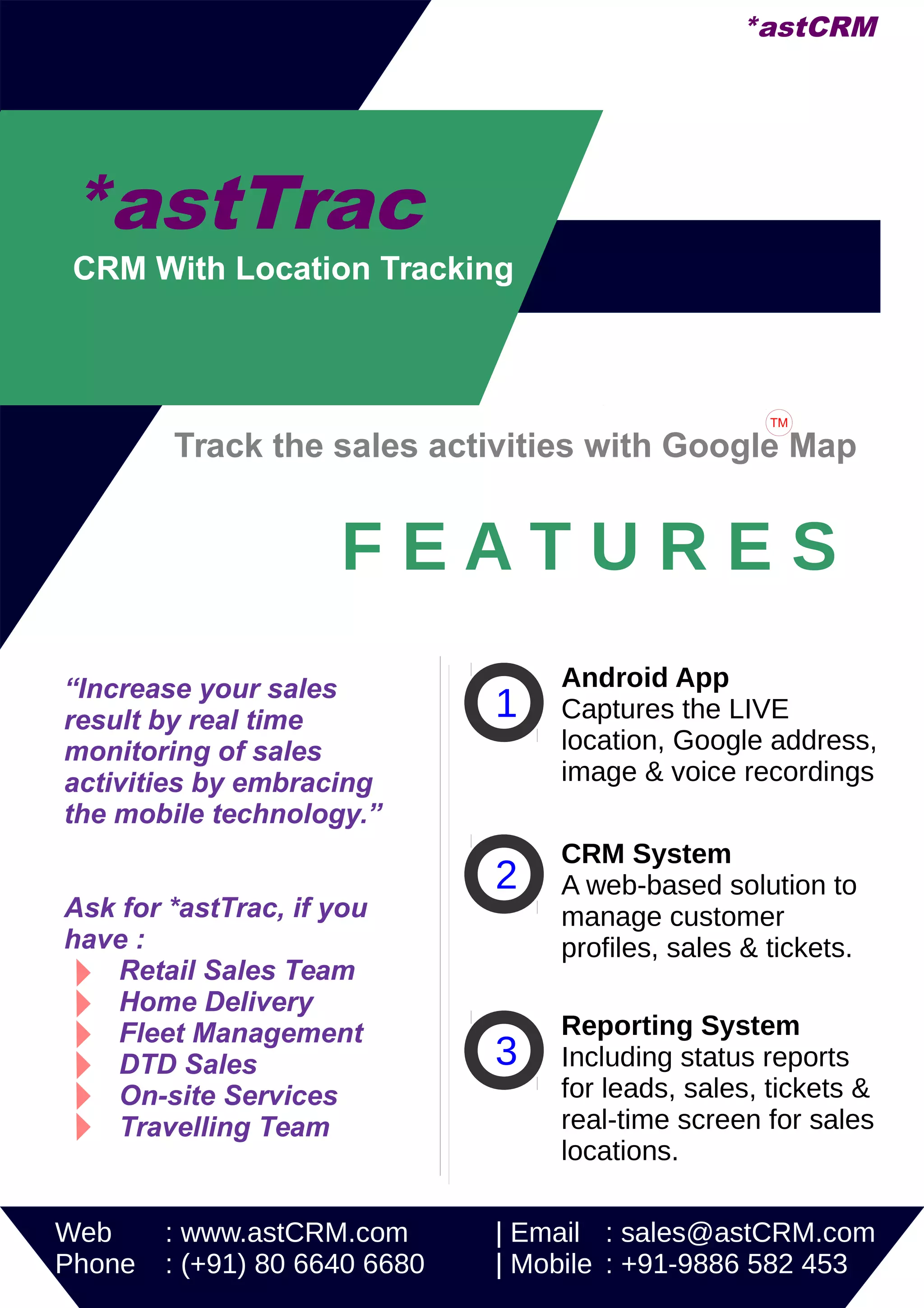 *astTrac is a location tracking CRM system that allows organizations to track sales activities, support updates, orders, deliveries and more with location data on Google Maps. It captures live location, addresses, images, voice recordings and other data from a mobile app. This data is integrated into a web-based CRM system for managing customer profiles, tickets and sales. Real-time reports provide visibility into lead status, sales locations and more. The mobile app and CRM system give sales and support teams visibility into field activities.