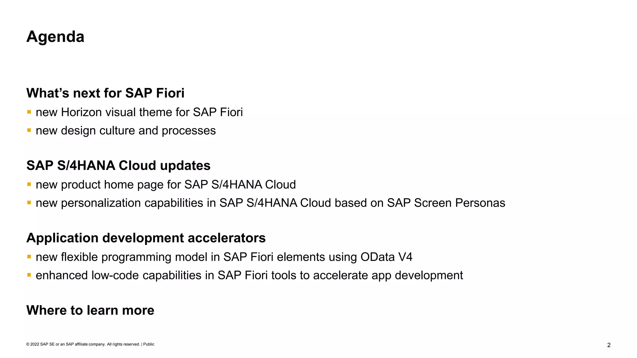 The document outlines SAP's latest updates and strategies for enhancing user experience through the new Horizon theme for Fiori and improvements in S/4HANA Cloud. Key developments include a new product homepage, personalized capabilities, and flexible programming tools intended to accelerate application development. The focus is on user-centered design, performance, accessibility, and iterating based on user feedback to improve overall usability and satisfaction.