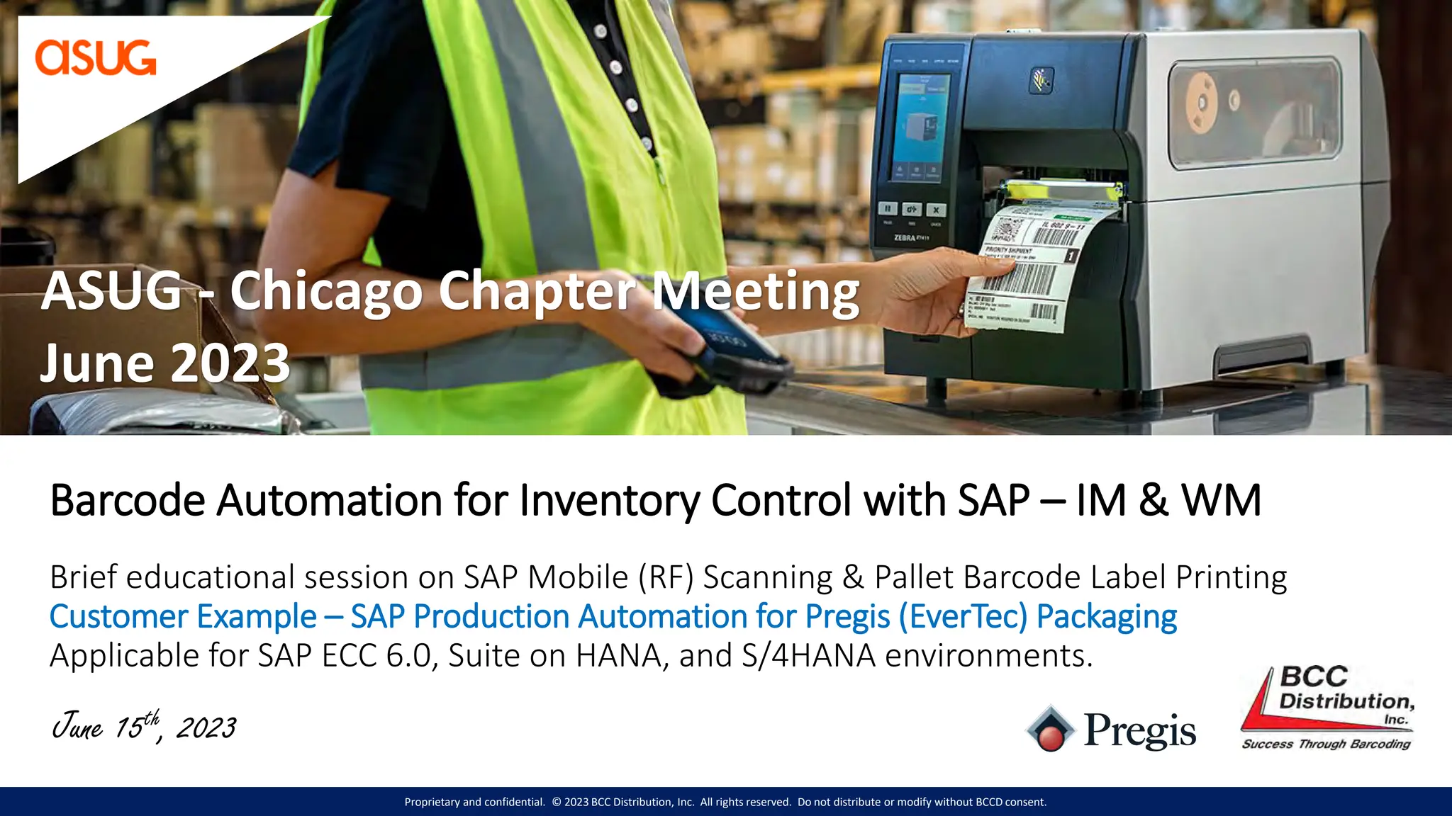 This document provides a summary of a presentation on barcode automation and inventory control solutions for SAP environments. It discusses how BCC Distribution and Pregis have implemented SAP mobile scanning and pallet barcode labeling to improve processes for inventory management, warehouse management, and production. The document outlines the companies involved, technologies used, and benefits realized, such as increased efficiency, accuracy, and reduced errors and downtime.