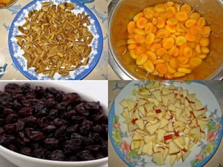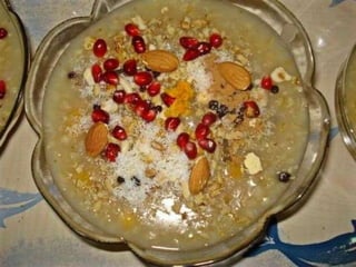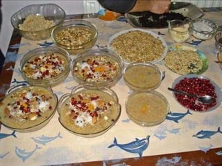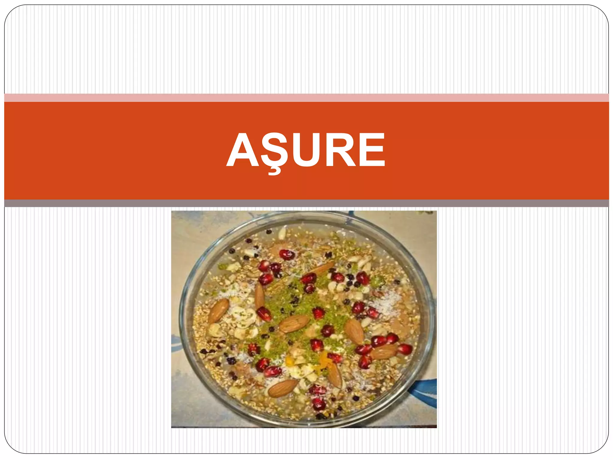 This document provides a recipe for Ashure, a traditional Turkish dessert made during Muharram. The recipe lists the ingredients which include cracked wheat, dried beans, chickpeas, dried fruits like apricots and figs, nuts, and spices. The instructions describe soaking the cracked wheat, beans, and chickpeas overnight then cooking them with water and adding the fruits and sugar. Once the sugar dissolves, the hot pudding is placed in bowls and garnished with nuts, seeds, and additional dried fruits to serve.