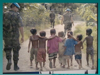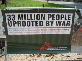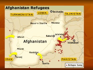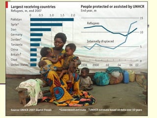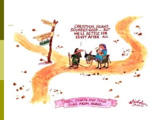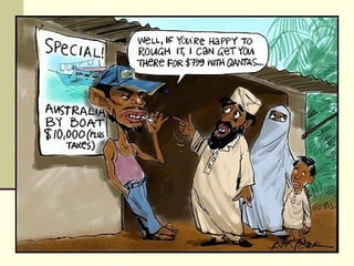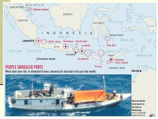 The document provides an overview of international laws, conventions, and agencies related to refugees and asylum seekers. It discusses key terms like refugees, asylum seekers, people smuggling, and trafficking. It also summarizes UNHCR's mandate to protect and assist refugees, and outlines some of the major refugee crises and camps currently being addressed by UNHCR around the world. Finally, it discusses Australia's policies and processes for assessing asylum applications and detaining unauthorized arrivals.