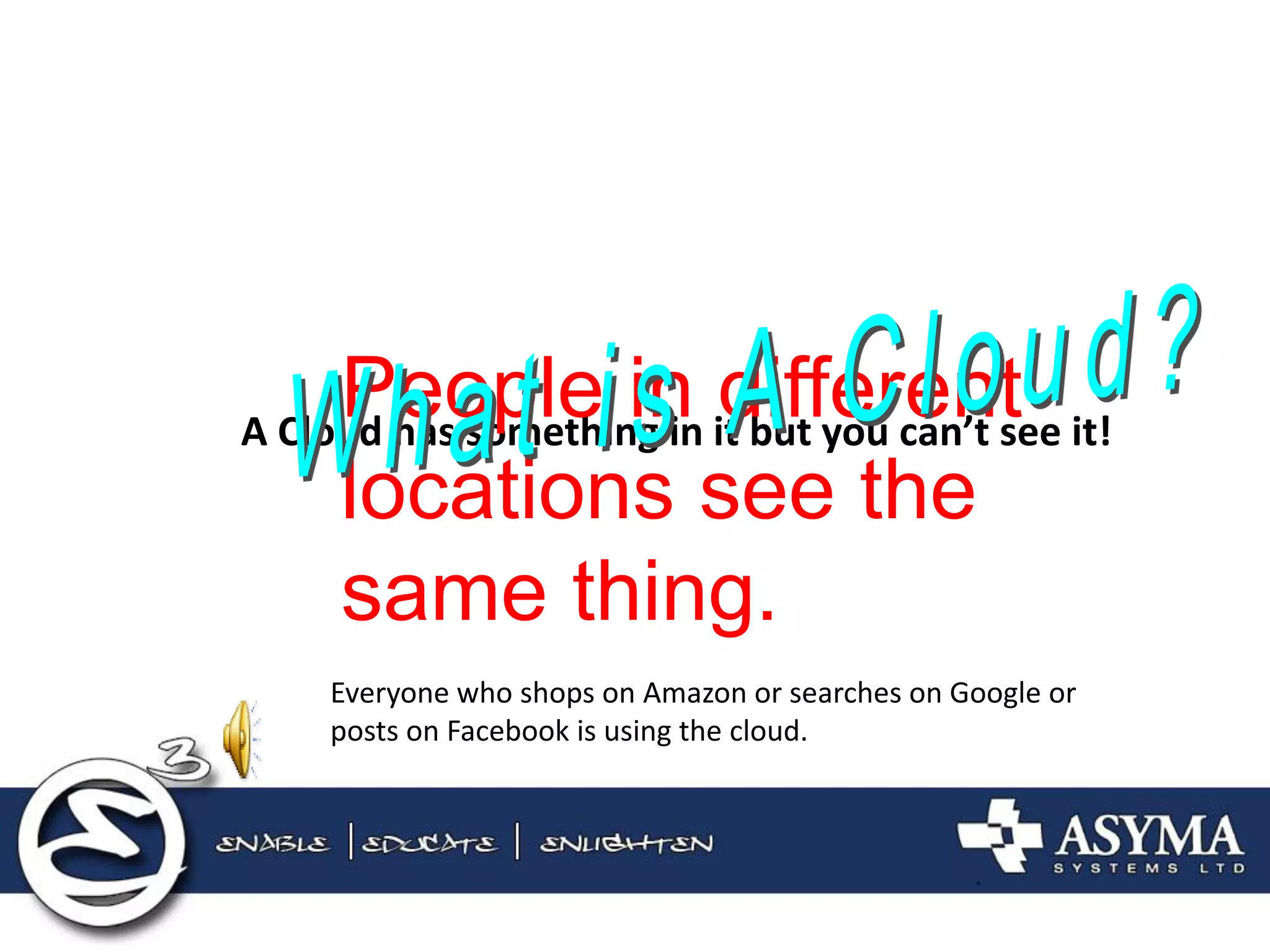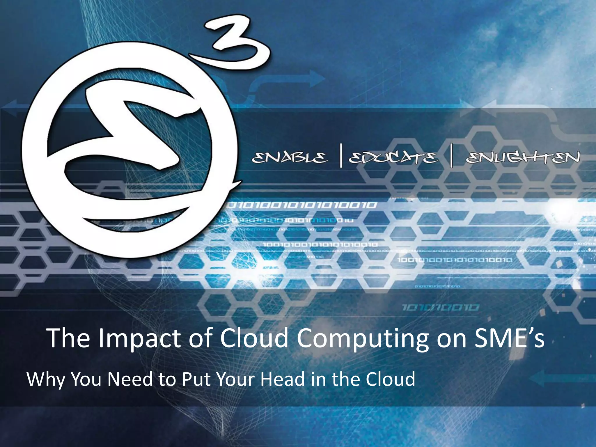 The document discusses how cloud computing can provide benefits to small and medium-sized enterprises (SMEs). It outlines how cloud services have evolved from time-sharing mainframes to today's software-as-a-service (SaaS) models. The cloud offers SMEs important advantages like reduced costs through economies of scale, lower barriers to entry since they don't need to purchase their own software and infrastructure, and improved scalability. While concerns around data security and control remain for some businesses, the cloud is becoming increasingly important for SMEs to remain competitive through improved productivity and flexibility.