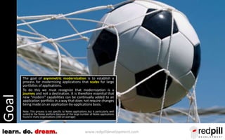Asymmetric modernization aims to systematically update application portfolios by introducing new capabilities without requiring individual application changes. This approach favors extending existing applications to ensure their continued operation while evolving modern interfaces driven by metadata and core functionalities applicable across multiple applications. Additionally, it emphasizes understanding existing code and usage patterns through forensics analysis to prioritize feature development based on actual user needs.