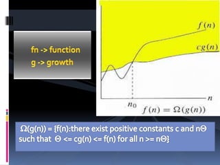 This document discusses asymptotic notations which are mathematical tools used to analyze the time and space complexity of algorithms. It introduces Big O, Big Omega, and Big Theta notations. Big O notation represents the upper bound and worst case time complexity. Big Omega notation represents the lower bound and best case time complexity. Big Theta notation defines the average time complexity of an algorithm. Examples are provided for how to determine the asymptotic notation of polynomial functions.