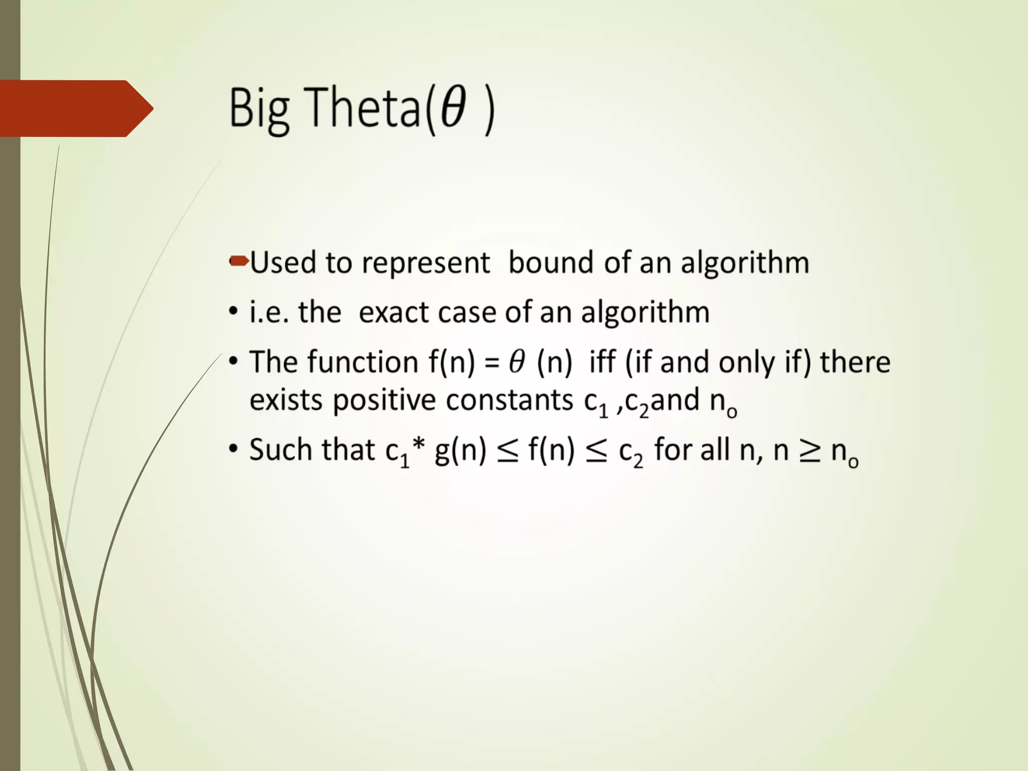 This document discusses asymptotic notation, which is used to express the time and space complexity of algorithms. There are three main types of asymptotic notation: Big Oh (O) notation provides an upper bound for the growth rate of a function; Big Omega (Ω) notation provides a lower bound; and Big Theta (Θ) notation provides both an upper and lower bound, describing the exact growth rate of a function asymptotically. Asymptotic notation is used because the exact time and space requirements of an algorithm cannot be determined and can only be expressed as a function grows relative to the input size.