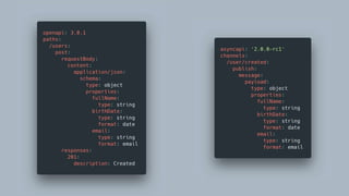 The document introduces AsyncAPI as a specification for creating event-driven applications and architectures, facilitating interactions across various protocols like AMQP, MQTT, and WebSockets. It emphasizes the need for event management, addressing key questions about event discovery, context, and purpose, comparable to RESTful API management. AsyncAPI promotes a common language for interoperability in designing and maintaining event-driven systems.